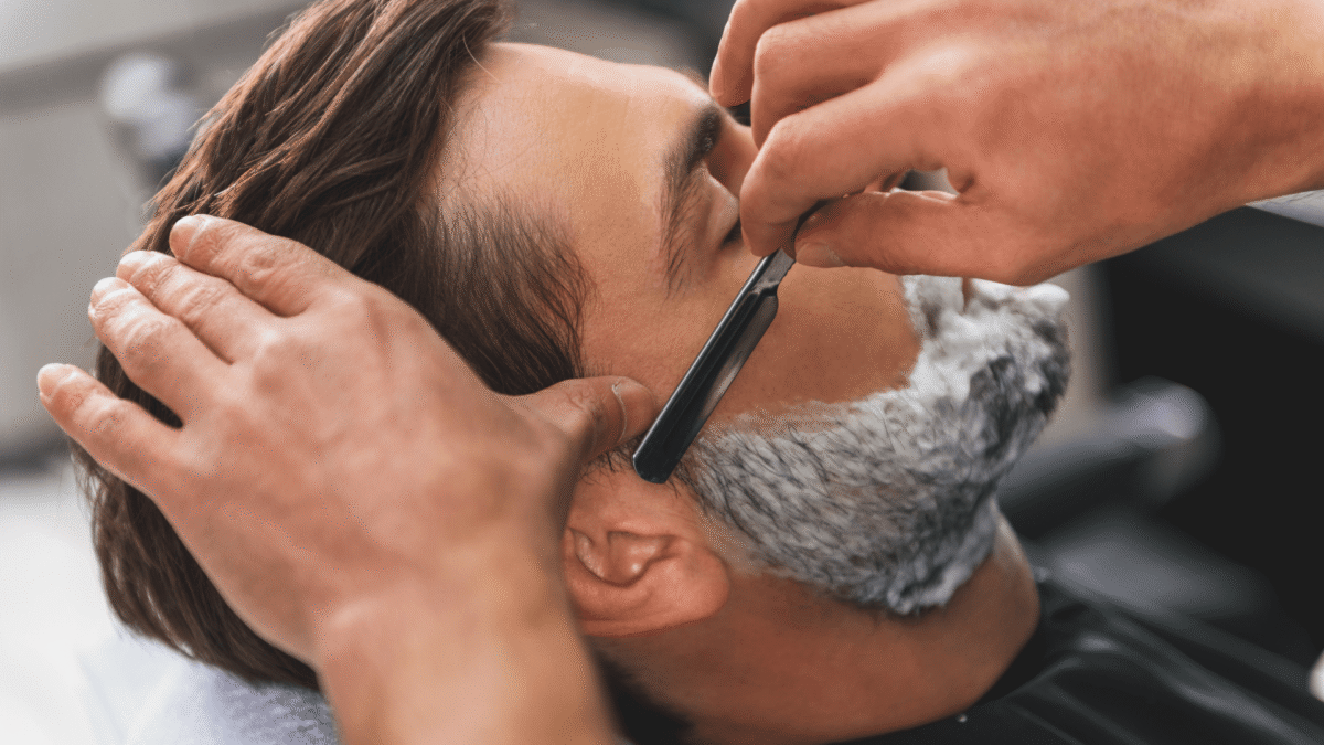 Navalha com toalha quente, óleos essenciais e pós-barba calmante.